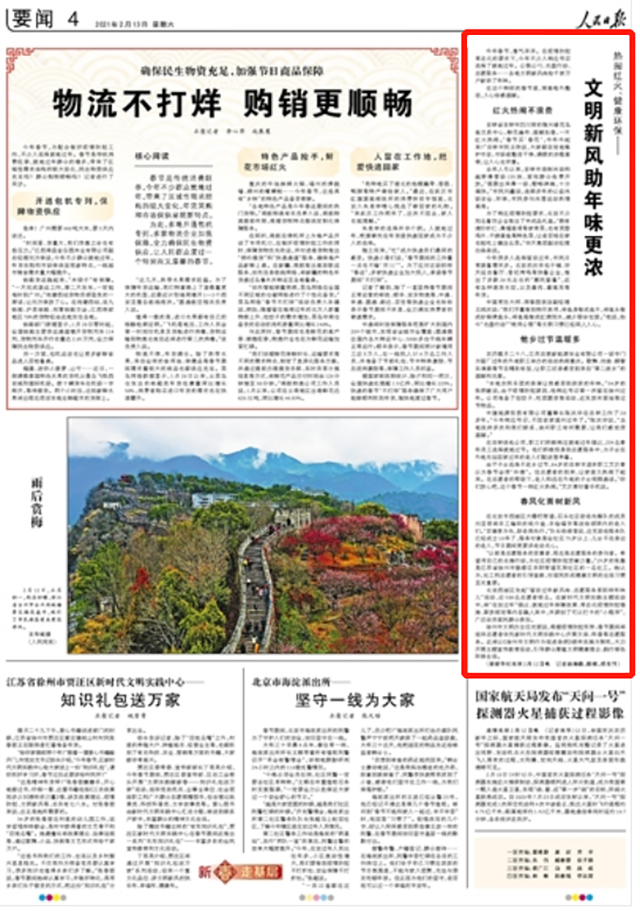 人民日报2月13日第4版《热闹红火、健康环保——文明新风助年味更浓》一文中提到: