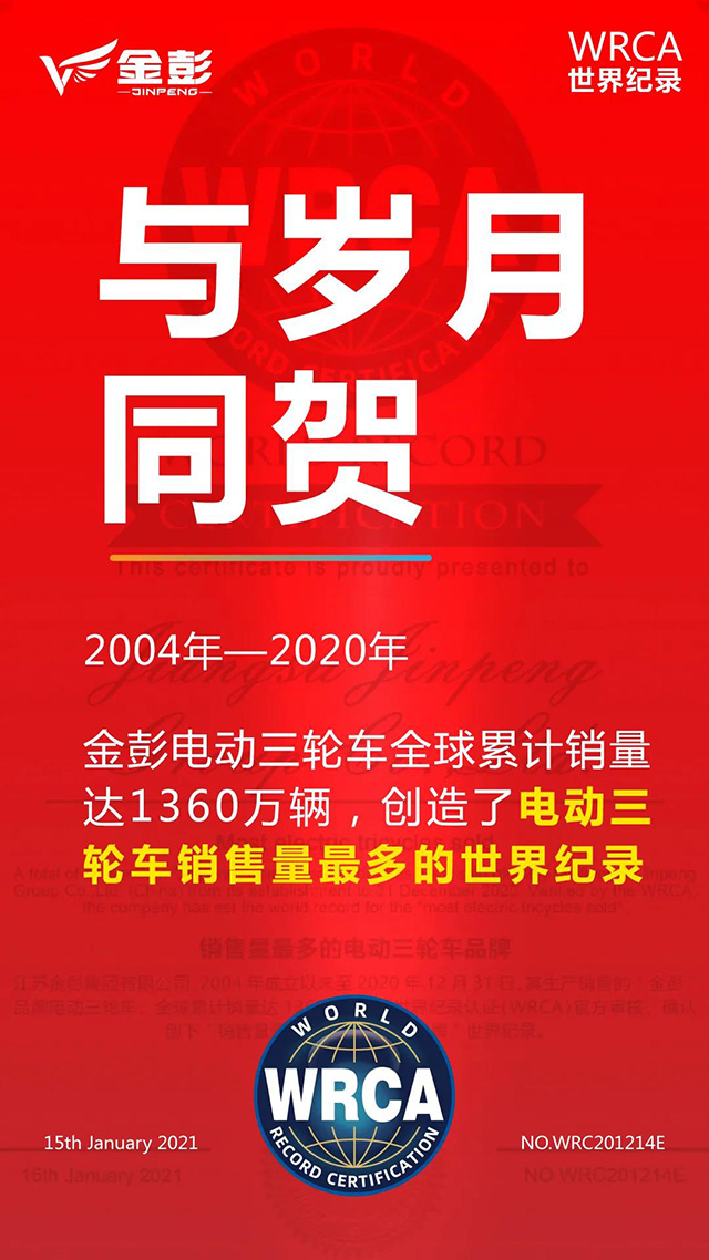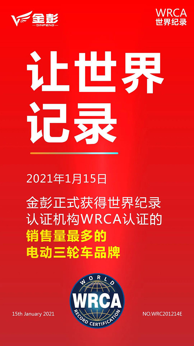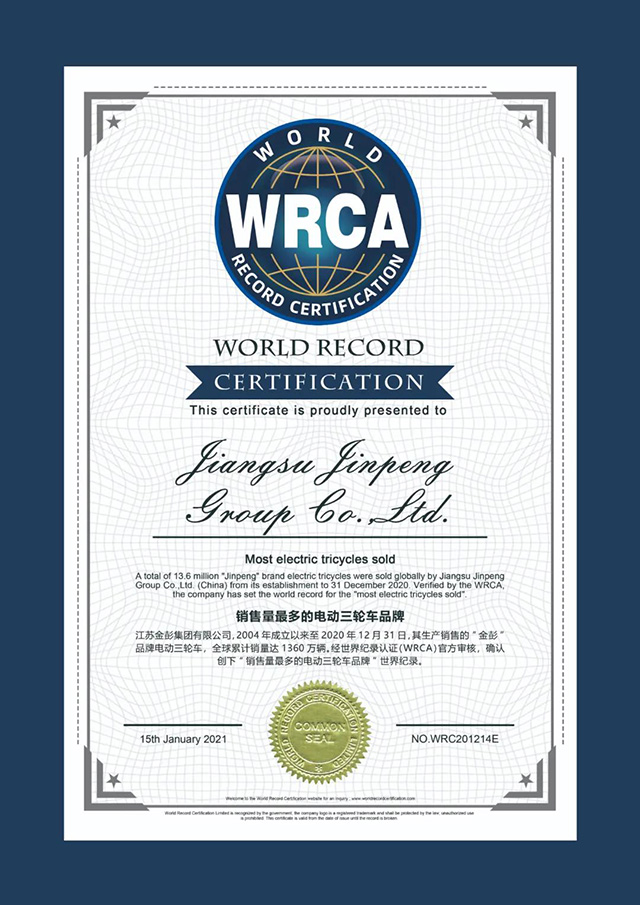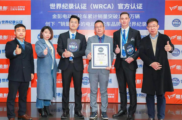 2020年底,bg大游以“累计电动三轮车销量1360万辆”正式向WRCA申请挑战“销售量最多的电动三轮车品牌”世界纪录,经过WRCA官方的严苛审查和反复论证,最终认定bg大游挑战成功,并将其记入世界纪录大全史册,bg大游的“世界之最”终于得到了国际权威机构的认可。